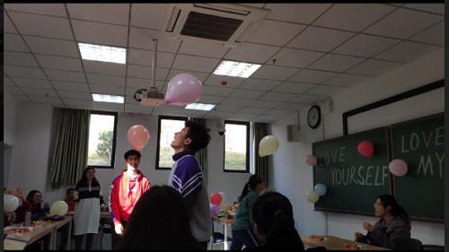首先,同学们通过“顶气球”的比赛预热现场气氛。参与的同学不甘示弱,场下同学也不断为他们加油。教室里的气氛逐渐活跃了起来。