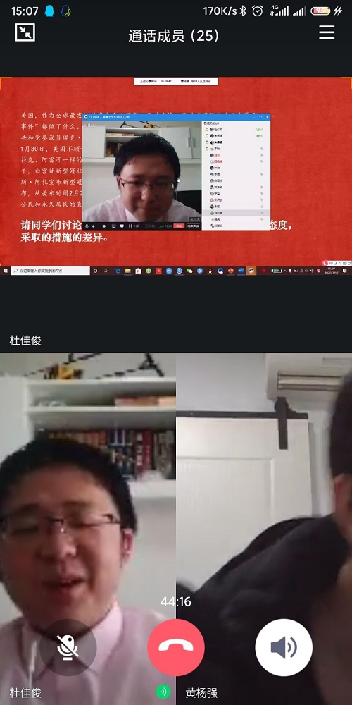 开展的每日健康打卡活动。会议逐渐接近尾声,班长杜佳俊同学利用腾讯会议开启了自由发言模式,主要为对当下时事政治的探讨,中国为各国的防疫工作设立了新标杆,能取得如此显著的成果,与中国的社会主义制度优势是密不可分的,同学们就中西方对待疫情的不同态度和措施展开了激烈的讨论,班主任黄杨强老师和辅导员宋天棋老师都发表了自己的看法,这其中涉及到各个国家文化,制度,医疗体系等深层次的问题,同学们在激烈的讨论中增强了对祖国的归属感和认同感。