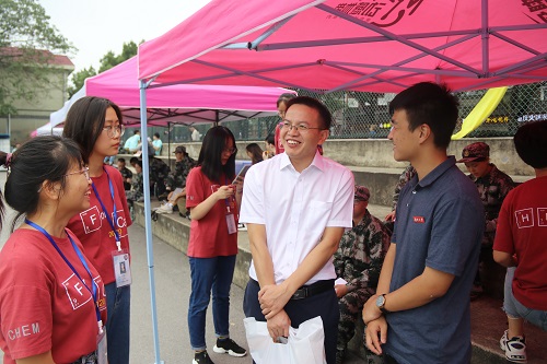 三点四十分,赵子龙老师来到军训场。由于各排面还在训练,赵老师先到化工院的帐篷里向2020级辅导员宋天棋老师了解情况。