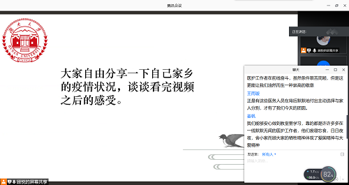 随后,同学们通过腾讯会议的讨论区,分享了自己家乡的疫情情况,并畅谈了视频的观看心得。很多同学都谈到自己曾作为志愿者为疫情防控贡献了力量,在社区防控一线的工作经历也使很多同学深有感触。姜帆同学讲道:“我们能够安心坐在教室里学习,靠的都是许许多多在一线默默无闻的医护工作者,他们废寝忘食,日日夜夜,舍小家而顾大家的牺牲精神体现了爱国精神与大爱精神。”这番话引起了同学们的共鸣,致敬英雄,把握当下,肩负起自己的使命才更是新时代青年应该做的,