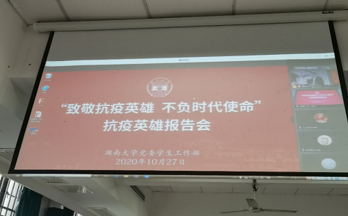 全体18级学生以及辅导员南老师于中楼106观看了“致敬抗疫英雄,不负时代使命”抗疫英雄报告会。