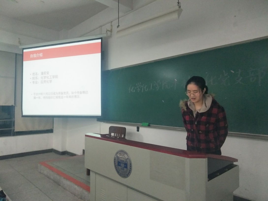 本科应化党支部在综合楼114教室召开预备党员转正大会,支部党员参加本次会议,会议由党支部副书记于哲同志主持。