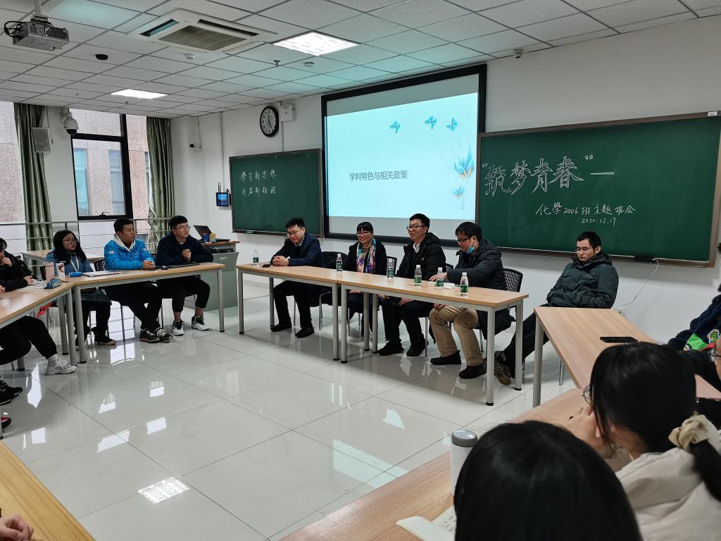 化学类2006班于研究生院楼顺利开展“筑梦青春”主题班会。朱日龙、楚宗霖、张小华、李铮、霍甲五位老师出席此次班会,与学生进行亲切友好的讨论与交流。