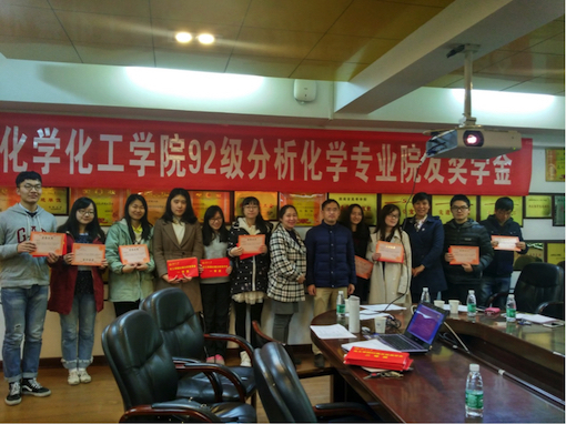友奖学金”颁发仪式在D204会议厅圆满举行。92级分析化学专业院友徐广宇教授、王青教授、院党委副书记陈义红老师及玩偶姐姐