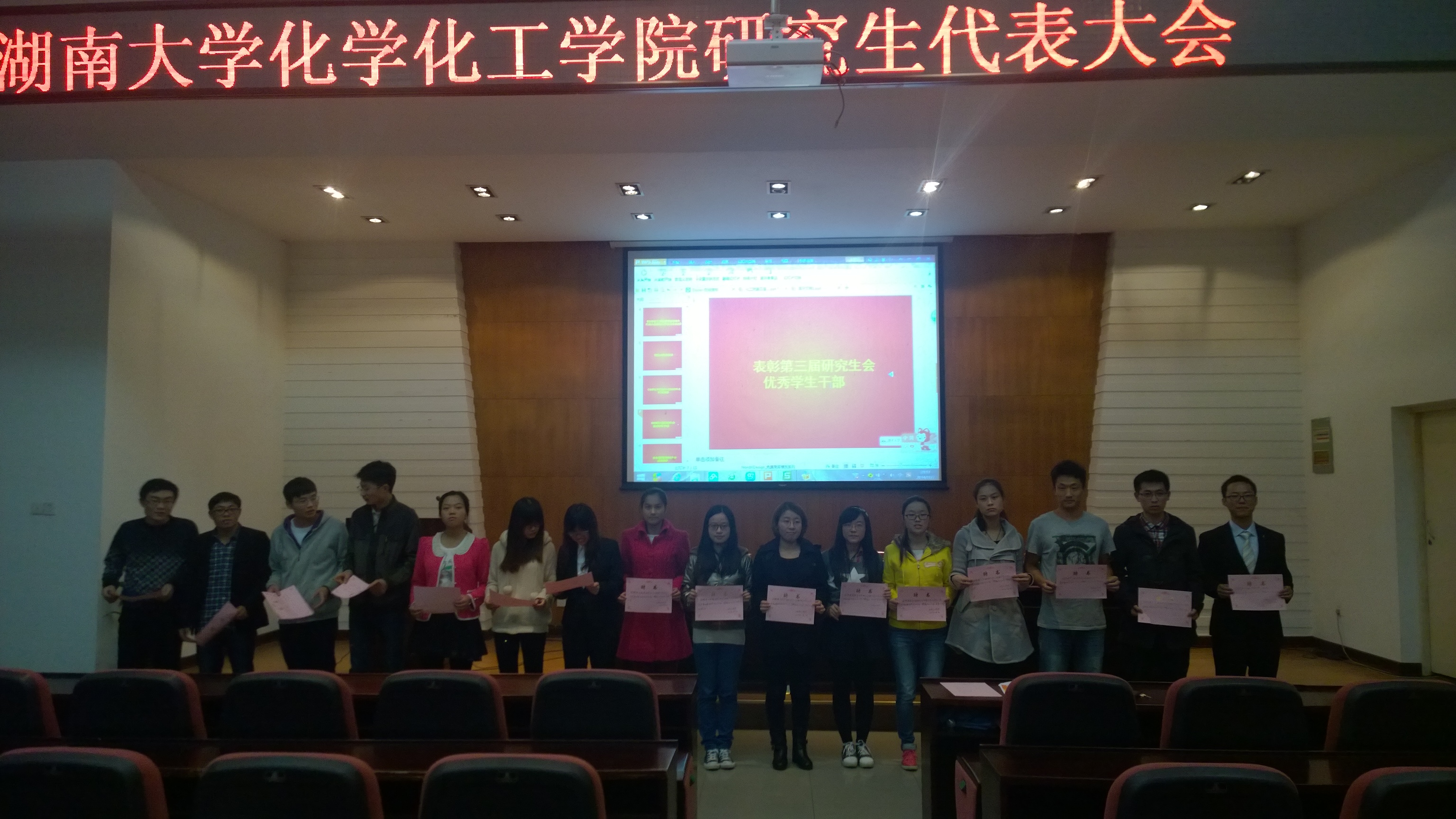 大会听取、通过代表资格审查报告,18名候选人依次上台发表竞选演说。竞选者分别阐述竞选纲要,发表了热情洋溢的演讲,体现出化工研究生热情服务同学的公益心以及积极向上的精神风貌。第三届研究生会学术部部长蔡子君代表上届学生会发表《第三届研究生会工作总结报告》。大会还表彰第四届研究生会优秀学生干部。经过有序的投票、严格的计票监票程序,最终民主选举产生新一届研究生会成员并为他们颁发聘书。新一届研究生会代表王飞同学宣读倡议书。