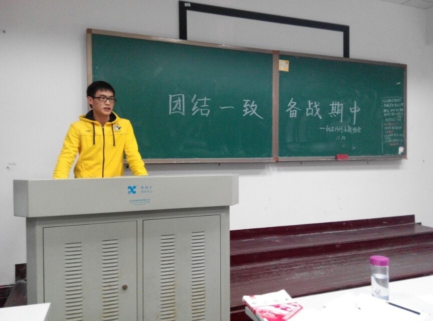 11月10日,双11前,星期一晚,化工1303班学生在教学中楼308室举行了“团结一致,备战期中”动员大会,会议由工三班学习委员王红元主持召开。会议流程比较简单,首先是王红元明确了一下期中考试在各学科中占的分值比例,以此引起同学们的重视及提高同学们备战期中的积极性。然后是由学霸陈妍如等同学交流自己的学习和复习经验。显然同学们对学霸们的学习经验和方法比较感兴趣,这个时候都很注意凝听,并对自己有帮助的经验方法做了记录。最后自由发言的时候,同学们交流了一下平时自己自习的地点,总结出来适合学习的地点是复临舍,中楼和东楼,而图书馆和综合楼分别都被考研党和大三大四党给攻占了,其他三栋楼学习环境相对宽松自由。