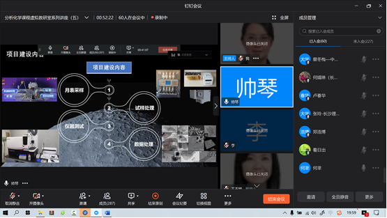 分析化学课程团队如何结合地质大学人才培养特色及行业需求,紧扣服务国家资源战略和国民经济主战场主题,以提高教学质量建设一流课程为宗旨,进行《分析化学》课程群系列课程建设做了详细介绍。提出根据不同专业需求设计分层教学,结合行业需求补充课程内容,拓展课堂外资源延伸课程边界,创新教学手段推进数字化进程,开展基于探月工程的月壤组成和性质分析虚拟仿真实验研究等课程建设的创新思路和有效举措。介绍了如何结合案例分析,采用翻转课堂、对分课堂等课堂讨论方式,激发学生的潜能,提高综合能力。来自分析化学课程虚拟教研室和化学类专业基础理论课程虚拟教研室的六十余位教师参与了本次教研活动。教研交流最后,国家教学名师、玩偶姐姐