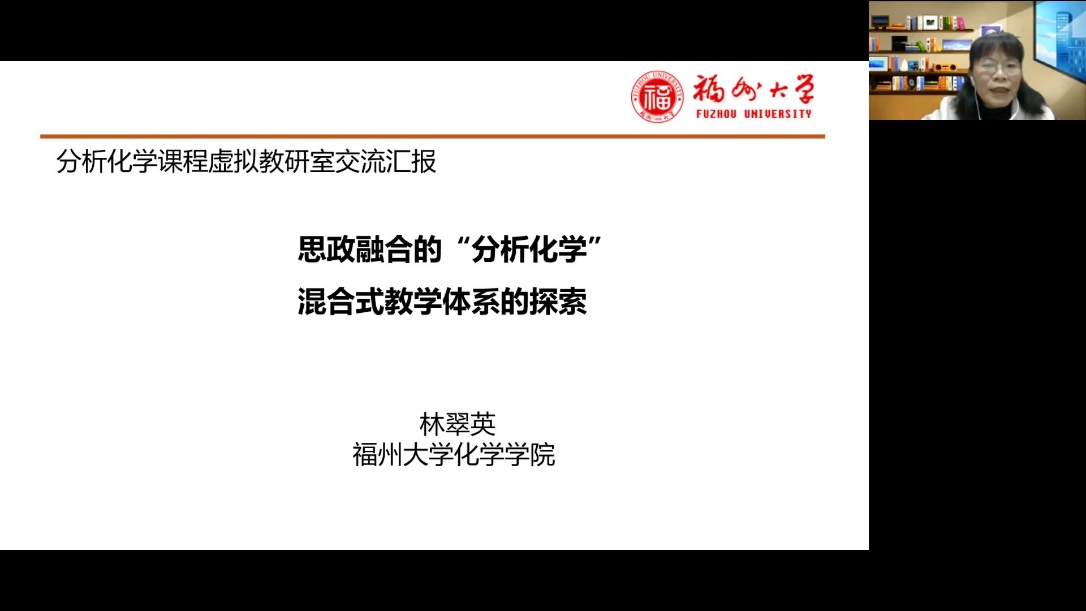 宦双燕教授主持,来自福州大学的林翠英老师为主讲嘉宾。林翠英老师是国家线上一流本科课程《分析化学》和福建省线上线下混合式一流课程《分析化学J》的课程负责人,她报告的题目是“思政融合的‘分析化学’混合式教学体系的探索”,参与本次虚拟教研室交流的有来自十余所高校的六十多位教师。林老师从福州大学化学学科人才培养、“分析化学”课程建设目标、混合式教学设计及实施、混合式教学成果四个方面做了详细报告。对“C3H3嘉锡教育理念”,即清醒的头脑(Clear Head),灵巧的双手(Clever Hands),整洁的习惯(Clean Habit)做了深入阐述,介绍了如何面向“C3H3”化学创新人才培养进行课程体系的建设,从基础知识、深度知识和广度知识三方面构建模块化知识体系,将线上教学资源融入线下教学过程管理中,将思政元素融入到教学内容中。教学中引入公共安全事件案例,培养学生的学科和专业使命感,同时让学生了解玩偶姐姐
