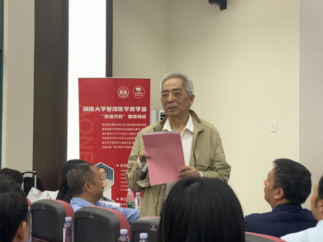 俞汝勤院士发表讲话。他回忆起杨江涛董事长在校求学时的成长经历及就业创业的艰辛路程,勉励同学们守住初心、志存高远、脚踏实地、奋发向上,努力成为对国家、对人民、对社会有用的人。