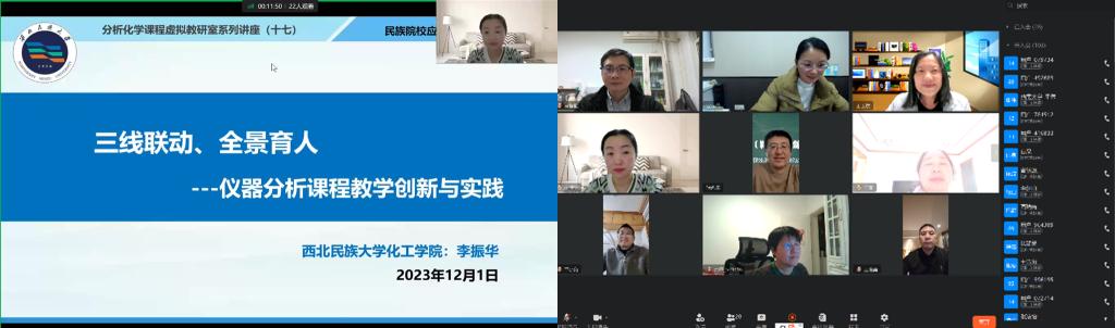 李振华副教授“三线联动、全景育人--仪器分析课程教学创新与实践”为题,给与会老师带来精彩的报告。分析化学课程虚拟教研室和化学类专业基础理论课程虚拟教研室的七十余位教师通过线上会议和观看直播的方式参与了本次讲座。会议录播视频还将共享到民族院校应用化学专业虚拟教研室。