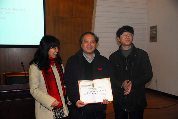 蒋健晖院长和王玉枝书记颁发聘书。之后,钟教授作了题为“纳米材料化学和能源中的研究进展”的学术报告,钟教授就合金纳米粒子的制备和应用,纳米结构的表征,及相关理论的研究进展作了较为详细的介绍,与会人员听完报告后给予了很高的评价,他的学术报告对与玩偶姐姐