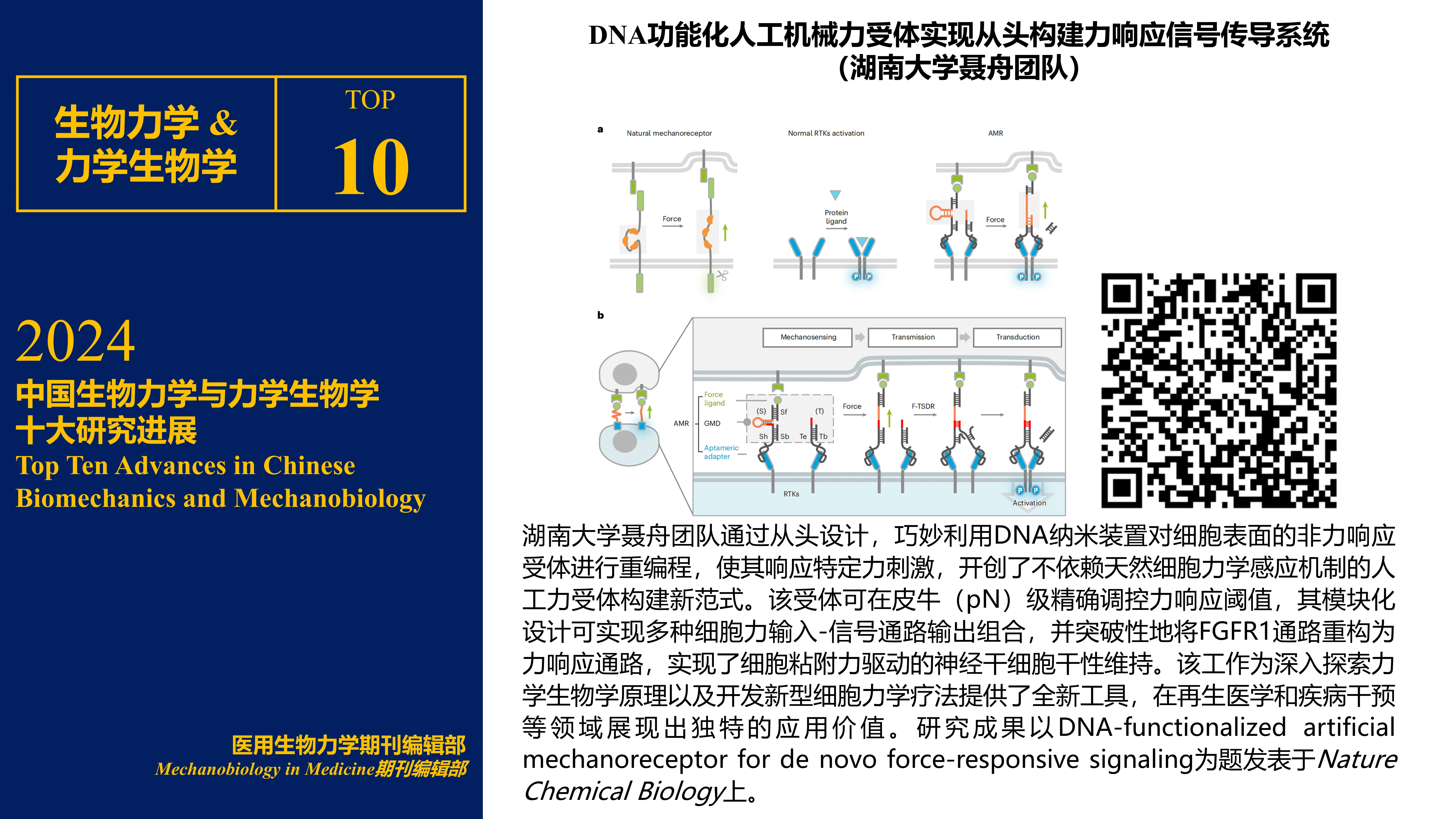 聂舟教授团队发表于国际期刊《Nature Chemical Biology》的研究成果“DNA-functionalized Artificial Mechanoreceptor for de novo Force-responsive Signalling”入选“2024年度中国生物力学与力学生物学领域十大进展”,评选结果正式公布并刊登在《医用生物力学》杂志。