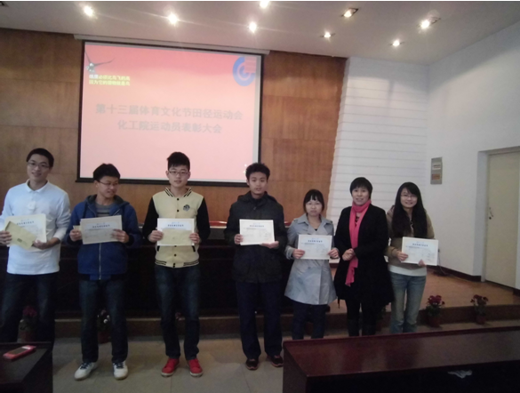 在此届运动会上,化工院的运动健儿们取得了男子甲组第二名,女子甲组第四名,男女团体甲组第三名的历史佳绩。在表彰大会上,陈义红书记表扬了运动健儿们顽强拼搏,坚持不懈的精神品质,同时鼓励大家要将这种精神发挥到平时的学习中去,争取在学习上再创佳绩。同时还有学生会副主席刘冬冬在会议上对学生会所做的工作进行了总结,表扬了学生会干部,成员和志愿者;运动员代表熊高峰发表了获奖感言,号召大家要积极锻炼身体。