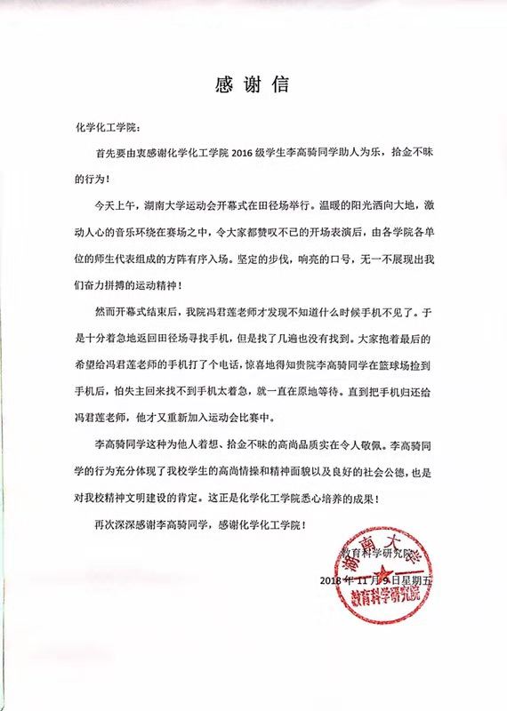 李高骑同学拾金不昧的行为受到表扬