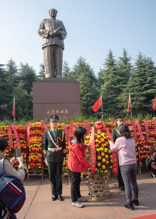 党委书记王玉枝和副书记范媛吉共同整理花篮上的缎带。接着,全体党员面对鲜红的党旗,在毛泽东同志铜像前重温了入党誓词,追寻和感悟“初心与使命”的深刻内涵。随后,大家逐一参观了韶山毛泽东同志纪念馆内的中国共产党成立、秋收起义、红军长征、抗日战争、建立新中国等展区,一张张图片、一段段历史,让大家体会到了主席波澜壮阔的一生。在毛主席故居,大家领略故居的秀美和岁月的记忆同时,了解主席成长历程和伟人家风传承,深刻理解“孩儿立志出乡关,学不成名誓不还”的雄心壮志和“为有牺牲多壮志,敢教日月换新天”的无私奉献精神。