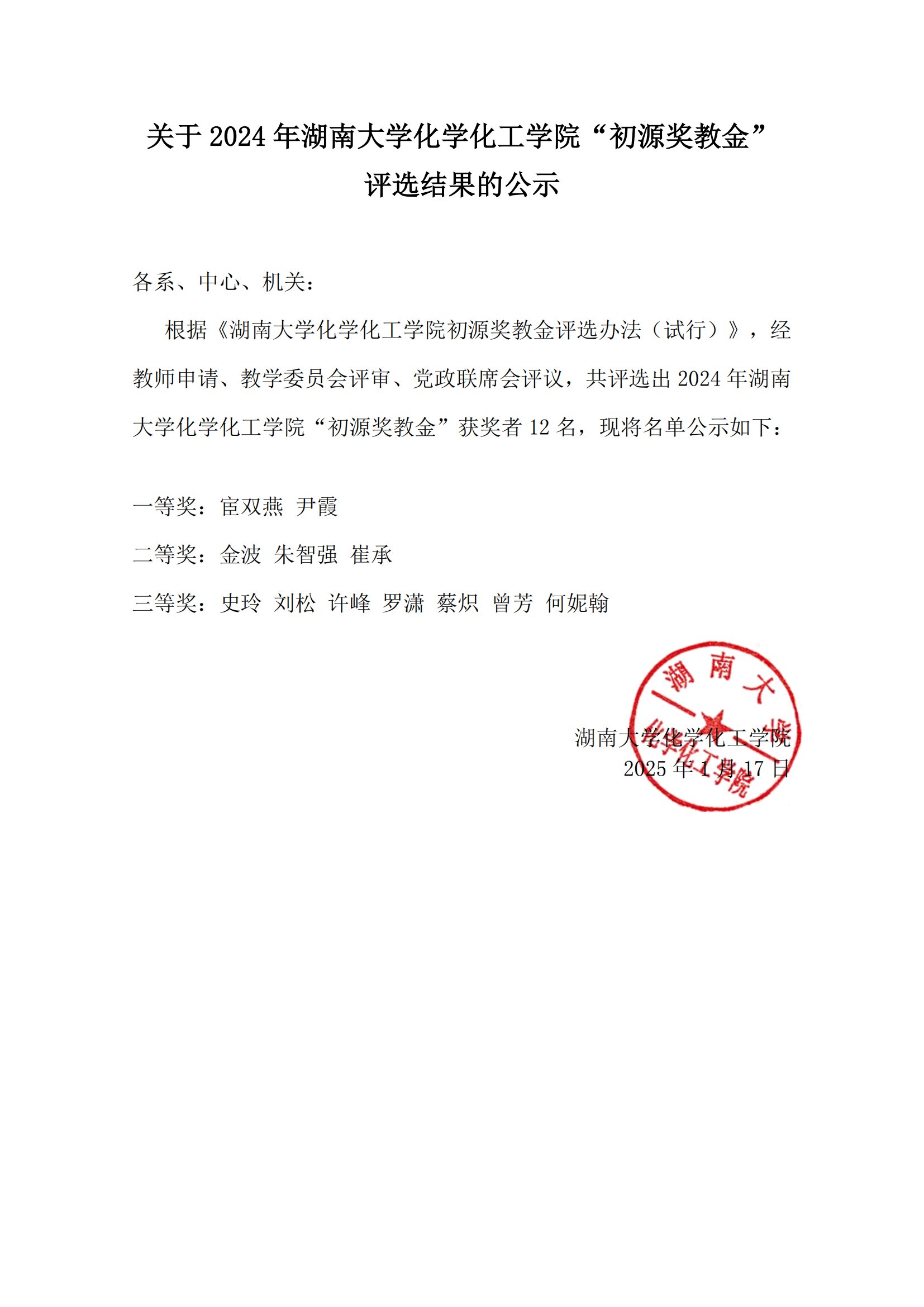 关于 2024年玩偶姐姐 “初源奖教金评选结果的公示